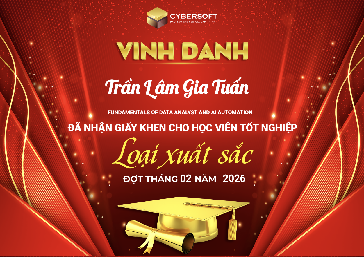 CyberSoft trân trọng chúc mừng các học viên đã hoàn thành khóa học với xếp loại Xuất Sắc. Đây không chỉ là kết quả của sự chăm chỉ, mà còn là minh chứng cho tinh thần kỷ luật, ý chí bền bỉ và khát khao phát triển bản thân.